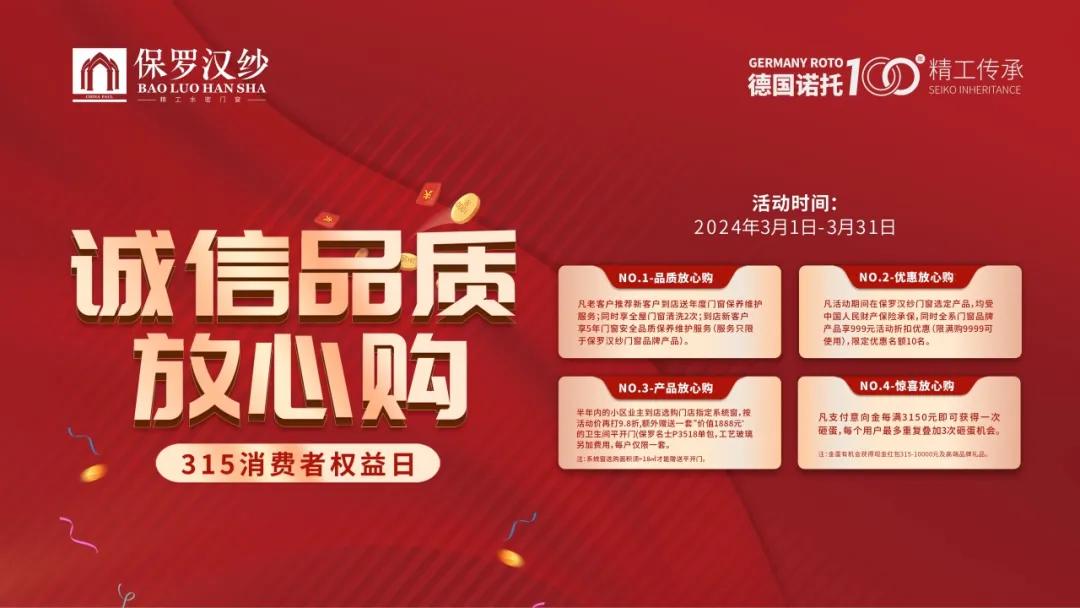 3月1日—3月31日,保羅漢紗門窗全國聯(lián)動(dòng)開展品質(zhì)承諾活動(dòng),推出“品質(zhì)放心購、優(yōu)惠放心購、產(chǎn)品放心購、驚喜放心購”等多重驚喜福利,給您質(zhì)惠雙享的消費(fèi)體驗(yàn)。