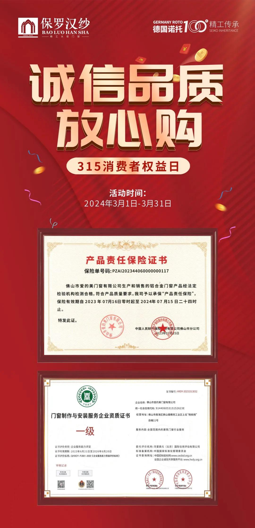 同時(shí),在保羅漢紗專賣店購買的門窗產(chǎn)品,均受PICC質(zhì)量承保!將消費(fèi)者最關(guān)心的品質(zhì)問題給予保障,讓您所購即所得,消費(fèi)更安心。