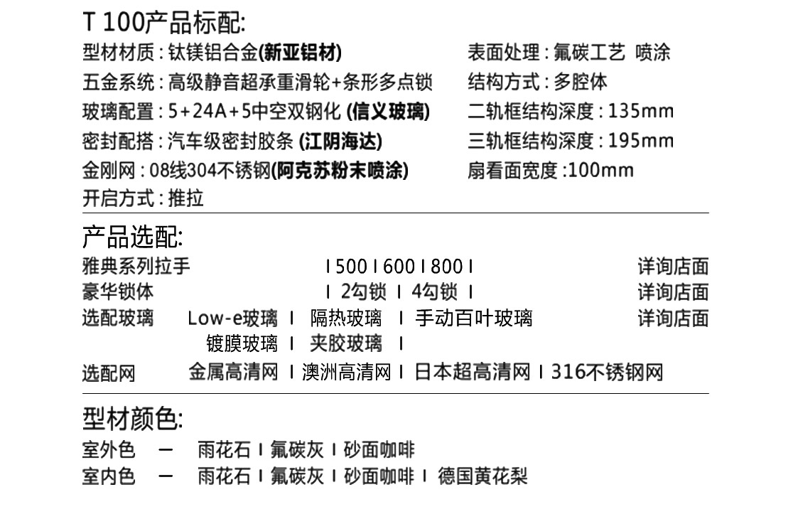 標(biāo)配: 0.8絲304金剛網(wǎng);選配0.6-0.9絲304金剛網(wǎng),可做擋水軌,平軌,低軌,走銅條;標(biāo)配五金配件:保羅漢紗條形鎖、重型不銹鋼尼龍輪、不銹鋼防擺輪;選配:凱森貝格條形鎖、D形拉手、雙勾鎖體、四勾防盜鎖體、六勾防盜鎖體、可做豪華緩沖門 |